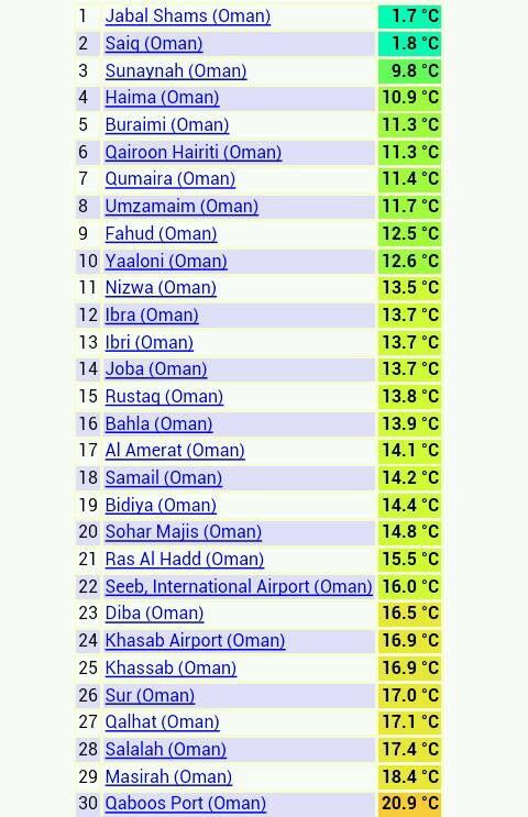 درجات الحرارة الصغرى المسجلة صباح اليوم بالسلطنة