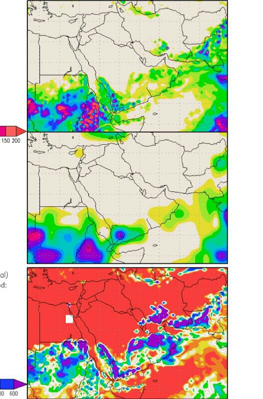 على مياه بحر العرب و عمان و الاراضي الهندية و الباكستانية و لكن الملاحظ في الخرائط نسب هطولات اقل من المعدل على سواحل الهند المطلة على بحر العرب.. ( هنا قد تكمن المؤشرات الجيدة بقلة تأثير العامل السلبي المتمثل في السحب العالية على تكونات حجرعمان )