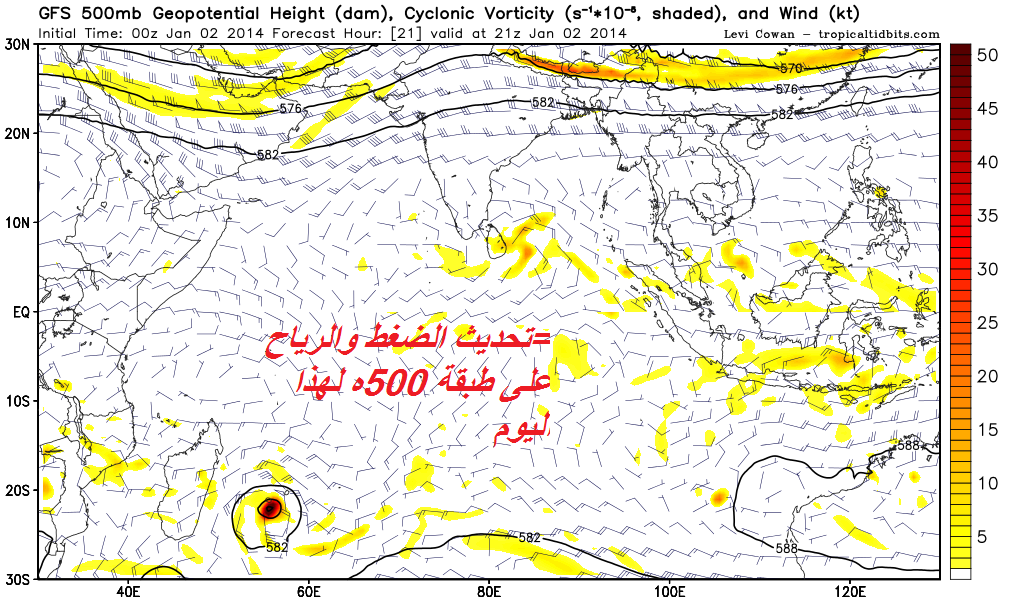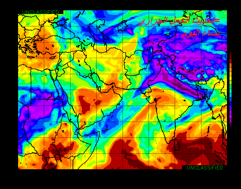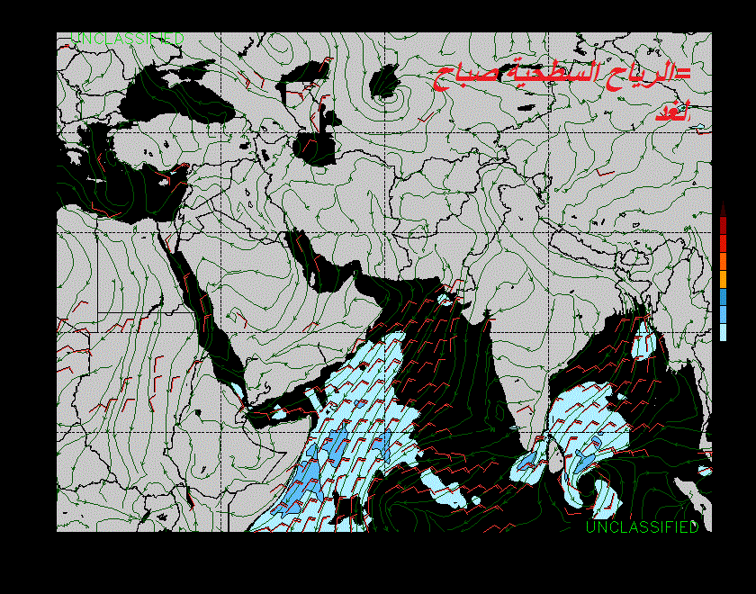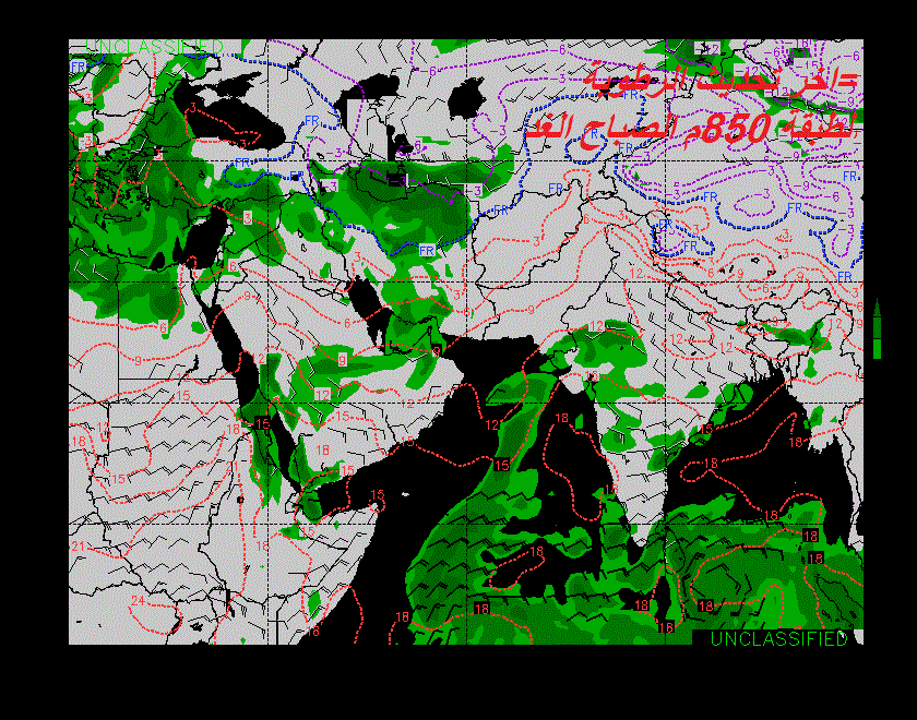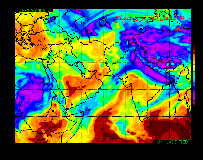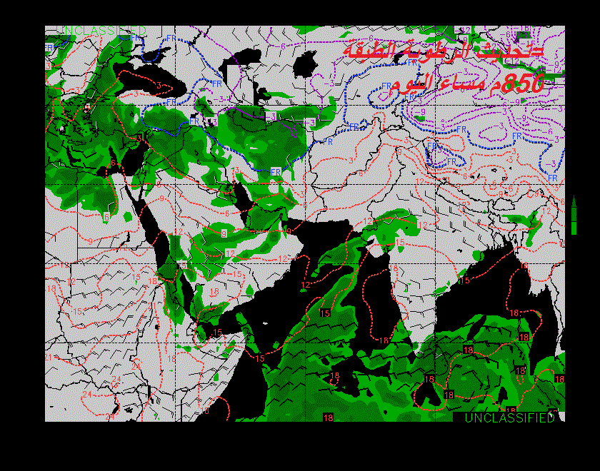 تشير النماذج العددية الى تأثر جنوب شرق شبه الجزيرة العربية بأخدود منخفض جوي يؤدي الى حالة من عدم الاستقرار في طبقات الجو العليا..