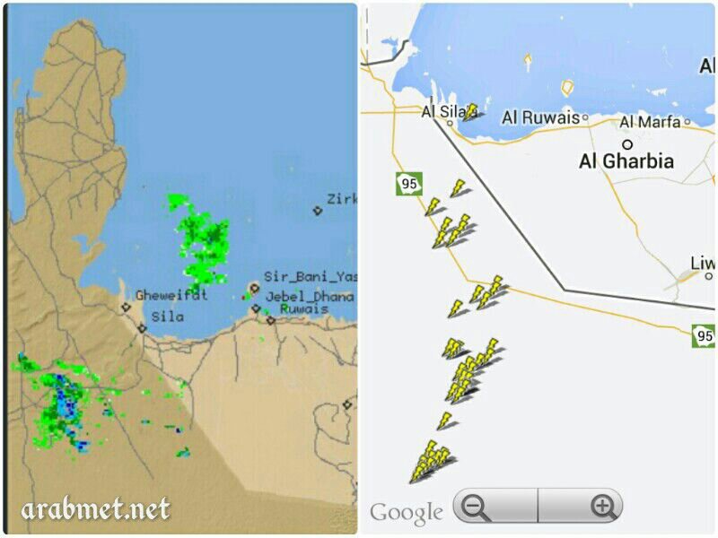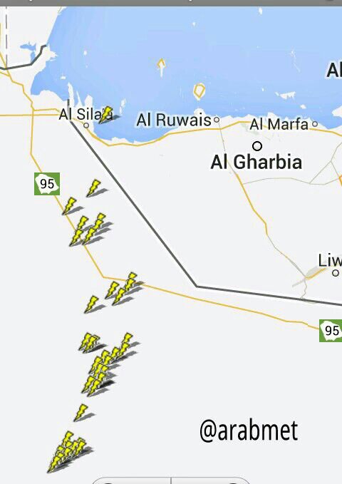- علامة خطأ تدل على أحتمالية ضعف البروق والسحب الرعديه بعد دخولها لصحراء الأمارات وتدخل الظاهره وباقي شمال السلطنه على هيئة سحب متوسطه وعاليه كثيفه مع هطولات خفيفه قد ترقى الى المتوسطه