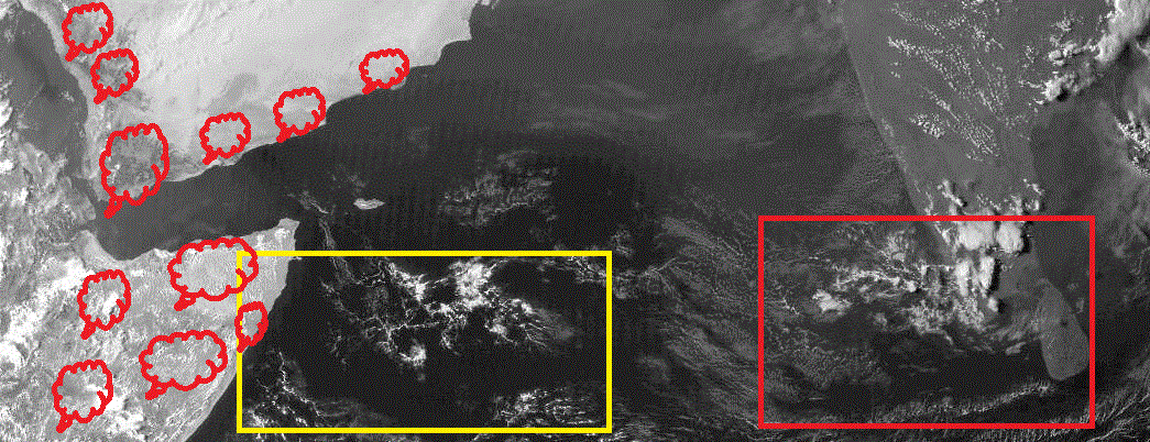 صورة لعصر اليوم ويلاحظ ازدياد السحب الركامية والعواصف الرعدية جنوب غرب بحر العرب قبالة سواحل الصومال