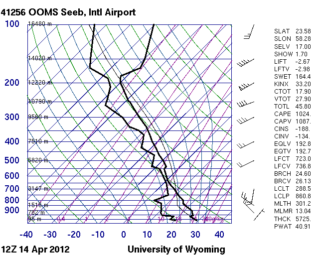 التوقعات الصادرة مساء 14/4 تشير إلى استمرار تأثر السلطنة ودولة الإمارات بحالة جوية من عدم استقرار سببها أخدود منخفض جوي في مستوى الغلاف الجوي ومن المحتمل نزول جيد للحالة الجوية على الإمارات وشمال السلطنة من فجر اليوم حيث تبين المعطيات تبريد مصاحب للمنخفض الجوي واندفاع الرياح الباردة والتقاها صباحا مع الرياح الجنوبية الشرقية على الإمارات وراح تتقدم الى السلطنة بعون الله
