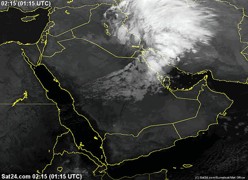 كما نلاحظ من صور الاقمار تأثر دول الخليج بمنخفض جوي وأمطار متفاوتة الغزارة من خفيفة الى متوسطة وأحيانا رعدية غزيرة في الكويت