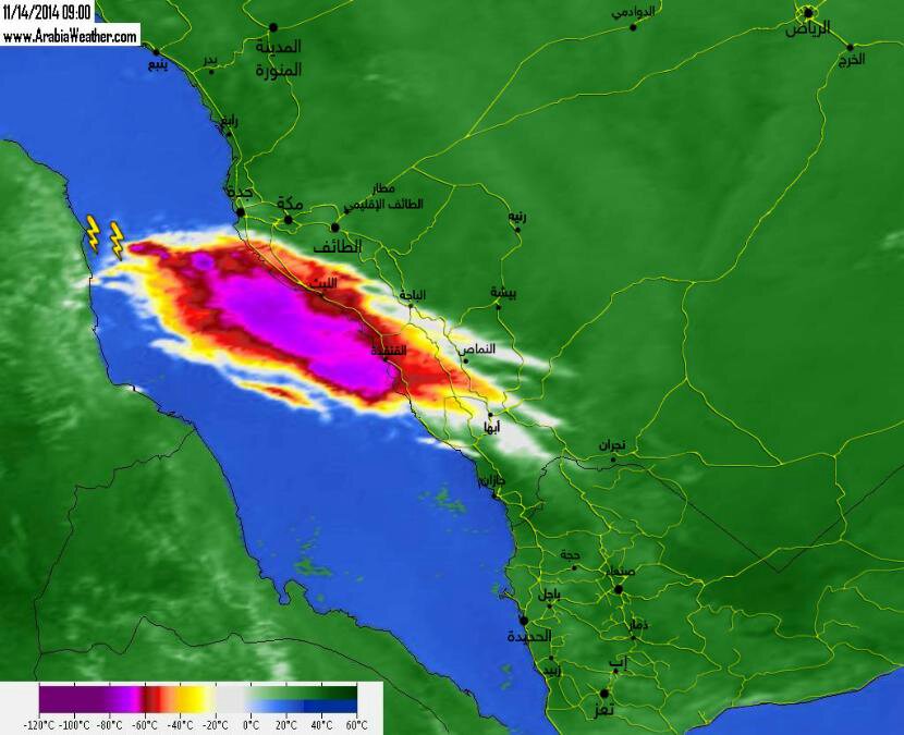 خلية ركامية رعدية ضخمة على البحر الأحمر تمتد إلى الطائف والباحة ومكة المكرمة