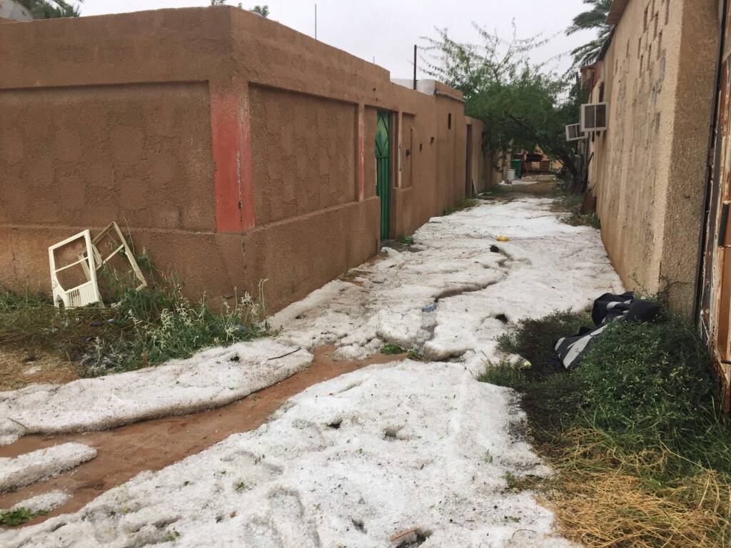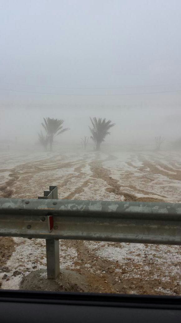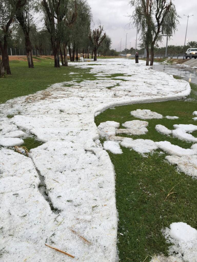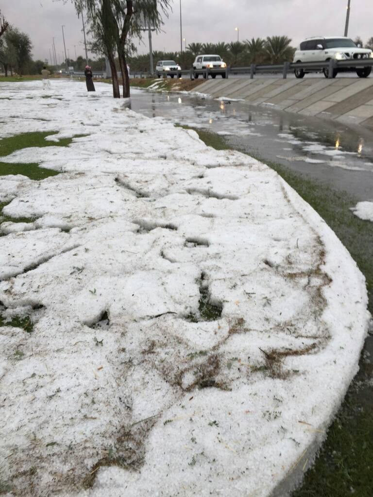 كميات البرد كبيرة في الهير وجريان الشوارع من البرد الحمد لله على هذا الخير