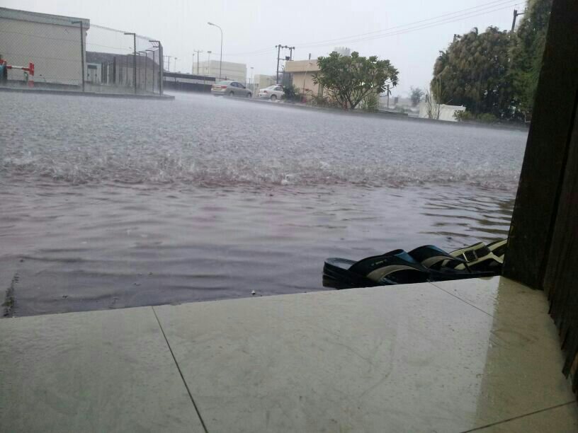 صوره معبره عن التجمعات المائيه الناتجه عن الامطار الغزيره التي شهدتها منطقة الخوض بالسيب