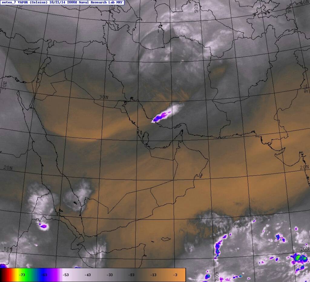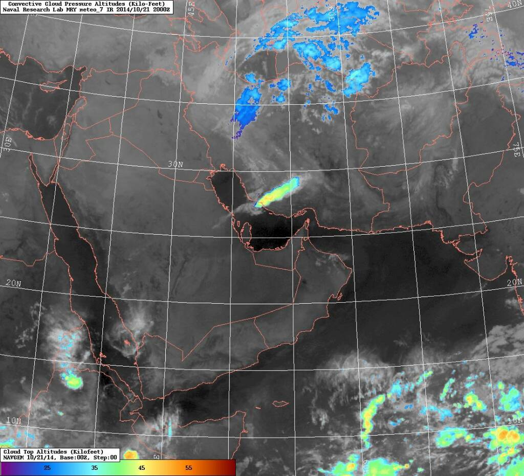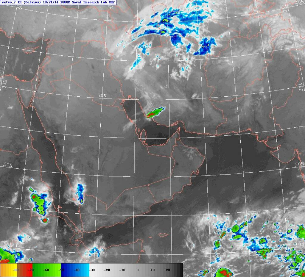 الأقمار توضح خلايا ماطرة بالمرتفعات على الحدود اليمنية السعودية وخلية أخرى على الأرضي الإيرانية بمقربة من الخليج العربي